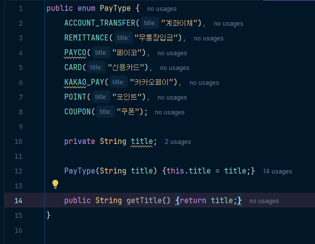 3) 인터페이스를 구현하는 Enum을 만든다(code, title getter 생성)