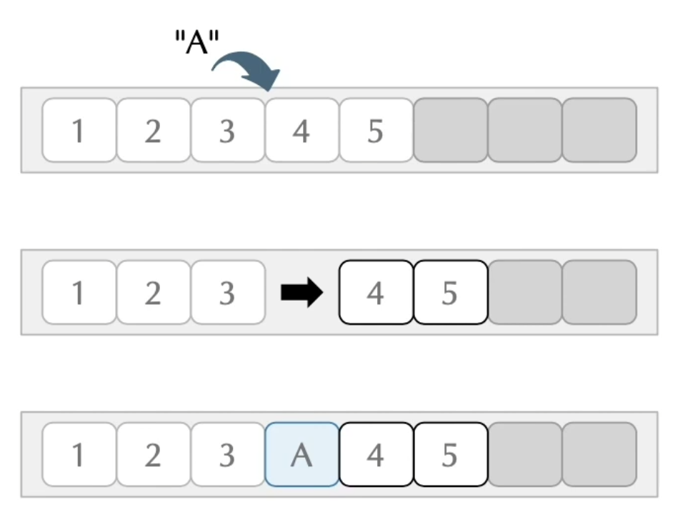 정해진 인덱스 값의 위치의 객체들을 하나씩 미루면서 삽입한다