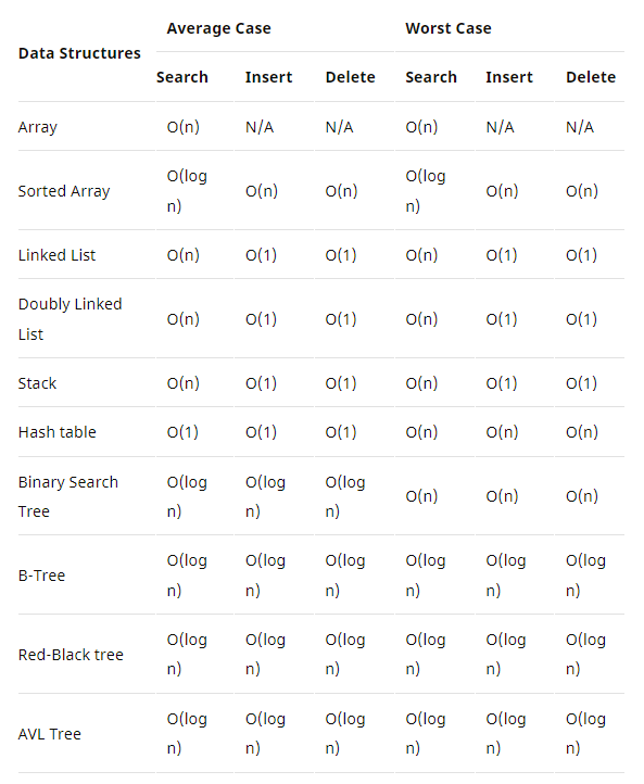 아래 그림은 자료구조와 명령어 별 시간복잡도를 보여준다
